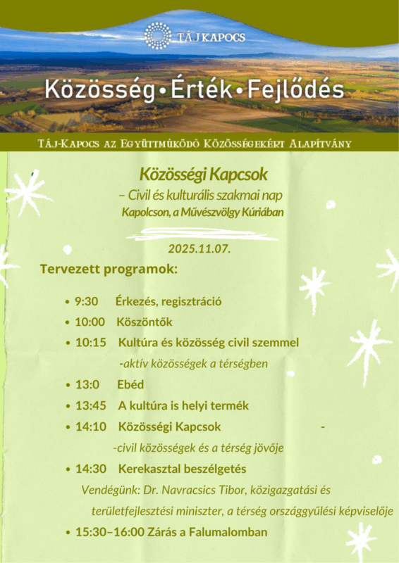 Szakmai napunk célja, hogy a civil és kulturális szereplők találkozzanak, tanuljanak egymástól, és közösen formálják térségünk jövőjét.”