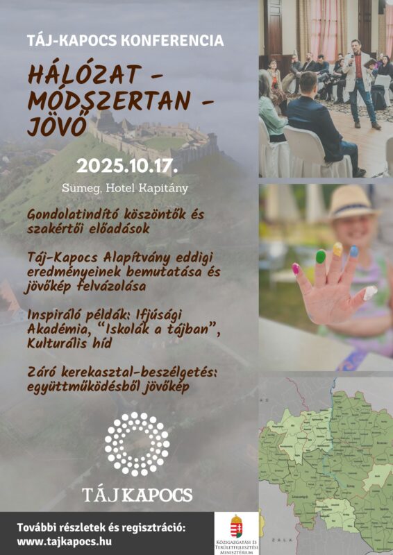 Tisztelettel meghívjuk Önt a „Táj-Kapocs: Hálózat – Módszertan – Jövő” című szakmai rendezvényünkre, amelyet a térség önkormányzatai, civil szervezetei, vállalkozásai és szakmai partnerei számára szervezünk.
